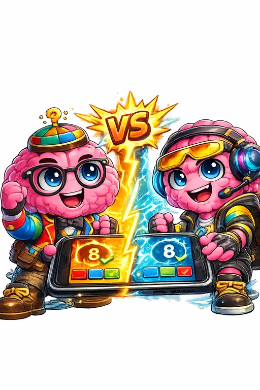 Modos turn-based o split-screen, 15 s por pregunta. Tie-break por velocidad. Las puntuaciones permanecen ocultas hasta que ambos terminan.